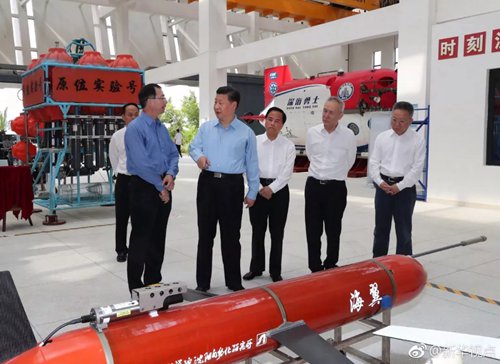 12日下午,習近平總書記來到位于海南三亞的中國科學院深??茖W與工程研究所,仔細察看“海翼”號深?;铏C、“天涯”深淵著陸器等設備,并同“深海勇士”號載人潛水器設計師和深潛團隊親切交談。