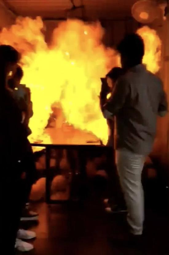 視頻剛開始的畫面是女孩準(zhǔn)備點燃生日蛋糕上的蠟燭,她的朋友們紛紛簇?fù)砩蟻?,用手機拍照,想要為她記錄這幸福的一刻。畫面中,女孩身穿一件灰藍色連衣裙,左臂內(nèi)側(cè)紋著一枚與眾不同的紋身圖案,四周被數(shù)十個粉色以及黑色的氫氣球圍繞著,接下來她劃了一根火柴,點燃了生日蛋糕上的蠟燭準(zhǔn)備許愿,緊接著,附近的氫氣球就突然發(fā)生了爆炸。房間里瞬間升起了巨大的火球,女孩也被火焰圍繞,她和朋友們都嚇得尖叫了起來。