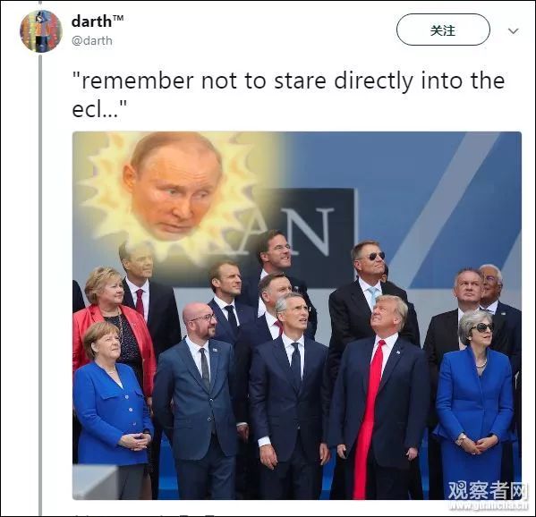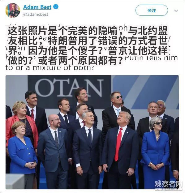 該照片目前已經(jīng)被西方各大主流媒體使用,作為其報道北約峰會的頭圖,比如美國《新聞周刊》、《時代》等。