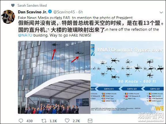 但是,白宮社群媒體主任史卡比諾 (Dan Scavino Jr。)卻站出來指責“假新聞”。他表示,當時各國領導人正在抬頭看天空中飛過的13國直升機,并配上了一張動作整齊劃一的照片。