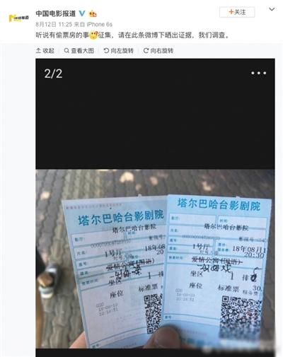8月12日下午,CCTV6電影頻道旗艦欄目官方微博中國(guó)電影報(bào)道發(fā)微博稱,“聽(tīng)說(shuō)有偷票房的事,征集,請(qǐng)?jiān)诖藯l微博下曬出證據(jù),我們調(diào)查?!迸鋱D中,是兩張《愛(ài)情公寓》的電影票,但電影名字被人工劃掉改成了《一出好戲》。在該微博的評(píng)論區(qū),也有不少網(wǎng)友聲明自己遭遇同樣狀況。接著,“愛(ài)情公寓涉嫌偷票房”的話題迅速登上熱搜榜。