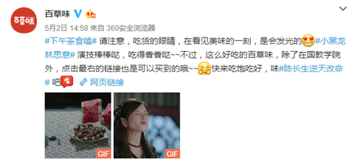 電視劇里收獲滿滿焦點(diǎn),宣傳上,也要給力才行。在廣大觀眾們忙著截圖曬圈時(shí),百草味的官方微博也沒閑著。電視劇播到哪,小編的截圖就跟到哪。緊跟劇情的同時(shí)附上店鋪鏈接,讓流量順利轉(zhuǎn)化為銷量。