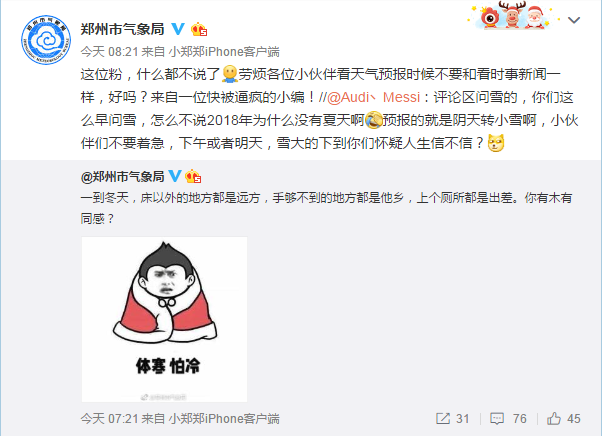 眾多網(wǎng)民發(fā)現(xiàn)不能玩雪,于是組隊(duì)去玩“鄭州市氣象局”了。在“鄭州市氣象局”的新浪微博上,網(wǎng)友有的調(diào)侃,有的逼問(wèn),把氣象局的小編已經(jīng)“逼瘋”。目前,該小編已經(jīng)開(kāi)始在微博上暴走,每小時(shí)更新一次微博,并且和每位回復(fù)的粉絲“較真”的討論起這讓人瘋狂的“暴雪”為什么還不來(lái)。