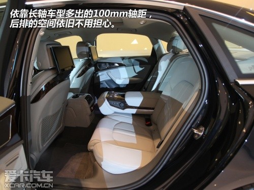 轉(zhuǎn)至后排,這里應(yīng)該同樣是車(chē)主們最為關(guān)注的,依靠長(zhǎng)軸車(chē)型多出的100mm軸距,后排的空間依舊不用擔(dān)心。而影音娛樂(lè)系統(tǒng)也同樣沒(méi)有被忽視,在座椅中間的操作面板中 ,除了沒(méi)有MMI touch手寫(xiě)板外,其它功能與前排幾乎相同。