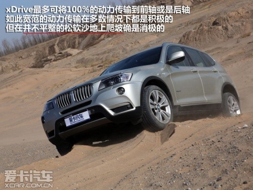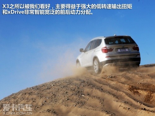 搭載3.0T發(fā)動(dòng)機(jī)的寶馬X3,很顯然比Q5更為“肌肉”,但面對(duì)松軟的沙坡它也清楚的知道:光有腿部力量是遠(yuǎn)遠(yuǎn)不夠的,還必須要結(jié)合上肢力量才有可能登頂,此刻,xDrive系統(tǒng)起到了決定性的作用。