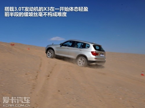 或許是奧迪Q5完成測試的過程比較順利,我們對(duì)接下來即將登場的寶馬X3也普遍比較看好,這或許就是思維慣性帶來的固定套路吧。然而在實(shí)地測試過程中,這臺(tái)X3攀爬沙丘的過程卻沒有表現(xiàn)出它在公路上所煥發(fā)出的霸氣。400牛·米的最大扭矩在城市道路中,甚至在高速公路上都是無與倫比的,但移步至眼前狂風(fēng)大作的沙丘,這400?!っ椎呐ぞ貏t像是心有余而力不足的悲情英雄。