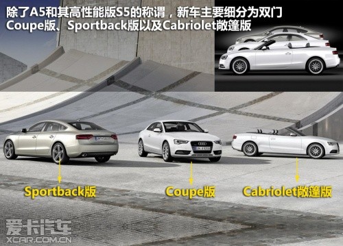 車型方面,2012款車型除了A5和其高性能版S5的稱謂,新車主要細分為雙門Coupe版、Sportback版以及Cabriolet敞篷版。據(jù)悉,此次國內(nèi)曝光的測試車輛是雙門Coupe版。