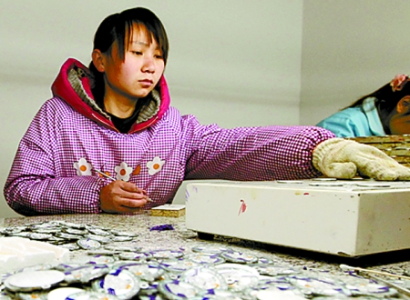 信陽市平橋區(qū)明港鎮(zhèn)大營村利用城郊地理優(yōu)勢,通過招商引資吸引外來投資3億多元。圖為3月27日,村民正在村里的合盛五金飾品加工廠制作徽章。 河南日報(bào)記者 鄧 放 攝