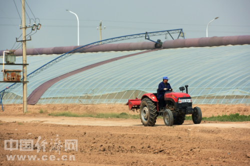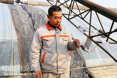 王莊鎮(zhèn)農(nóng)民陳學(xué)文在查看自動(dòng)化大棚卷簾機(jī)