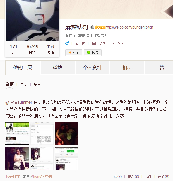 該微博也引起了不少熱心網(wǎng)友的注意,微博@麻辣婊哥懷疑@柏煊summer在刻意炒作,微博稱:“@柏煊summer 在周迅公布和高圣遠(yuǎn)的戀情后模仿發(fā)布微博,之后稱是朋友,居心叵測,個人簡介換得挺快的,不過得到關(guān)注已經(jīng)目的達(dá)到。不過話說回來,摟腰與共臥的行為也太過親密,絕非一般朋友,但周公子閱男無數(shù),此女威脅指數(shù)幾乎為零。 ”