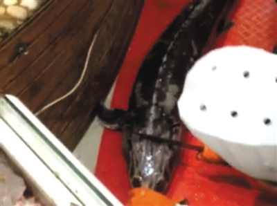 在海鮮市場海鮮廳另一攤位,擺放著一條約30斤的鱘鰉魚。攤位女老板告訴記者,死了的鱘鰉魚16元/斤,活的、重量在四五十斤的鱘鰉魚售價22元/斤。