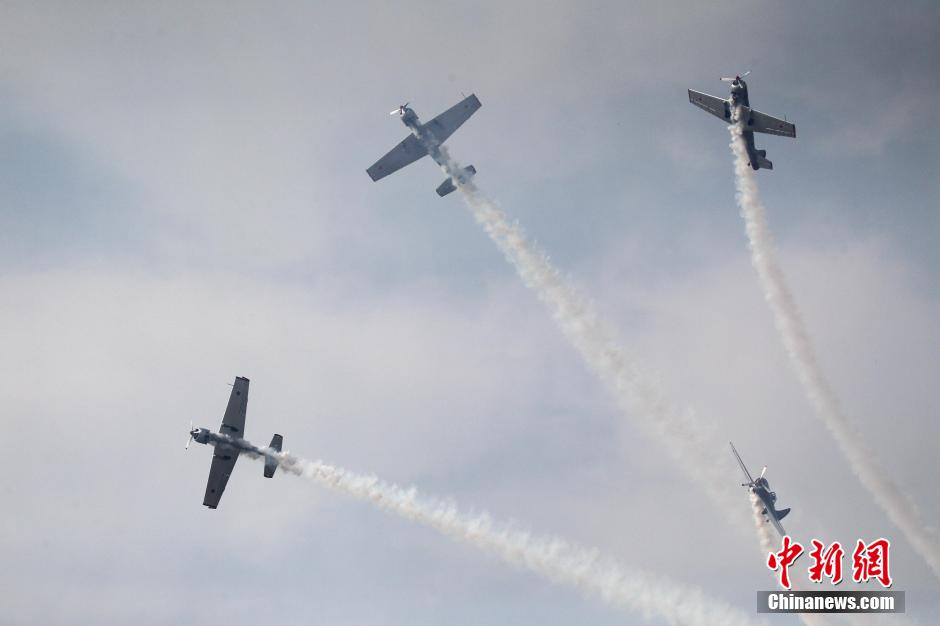 9月24日,河南鄭州上街機場,參加2015鄭州航展的特技飛行員們,穿云破霧在加緊練習(xí)表演動作,沖刺9月25日開幕的鄭州航展。中新社記者 王中舉 攝