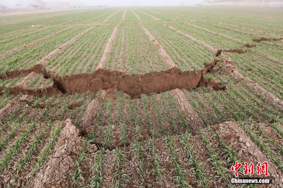 12月25日,山東平邑,位于平邑縣保太鎮(zhèn)的玉榮商貿(mào)有限公司石膏礦發(fā)生坍塌事故。圖為礦區(qū)塌陷的麥田。視覺中國供圖