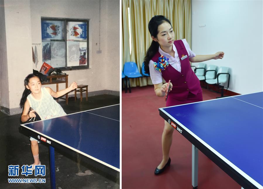左圖:9歲的趙妍卿在打乒乓球(2000年攝,資料照片);右圖:5月25日,南昌鐵路局福州客運(yùn)段動(dòng)姐趙妍卿在單位乒乓球活動(dòng)室打球(新華社記者 宋為偉 攝)。新華社發(fā)