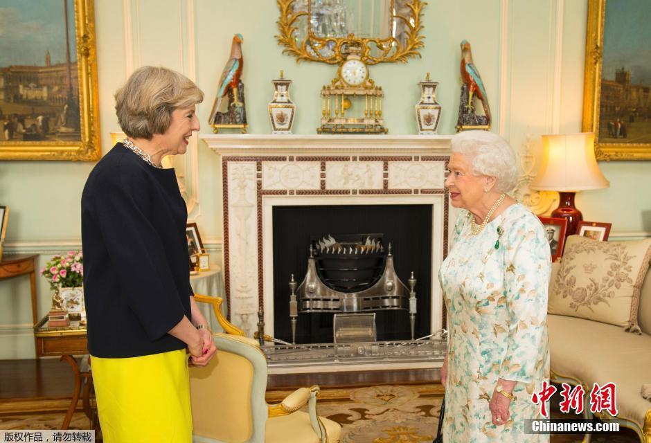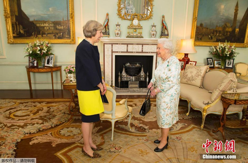 當?shù)貢r間2016年7月13日,英國倫敦,英國女王伊麗莎白二世在白金漢宮接見特蕾莎·梅,并任命其為新首相。特蕾莎是英國女王伊麗莎白二世在位期間的第13任首相,同時也是繼撒切爾夫人后的第二位女首相。
