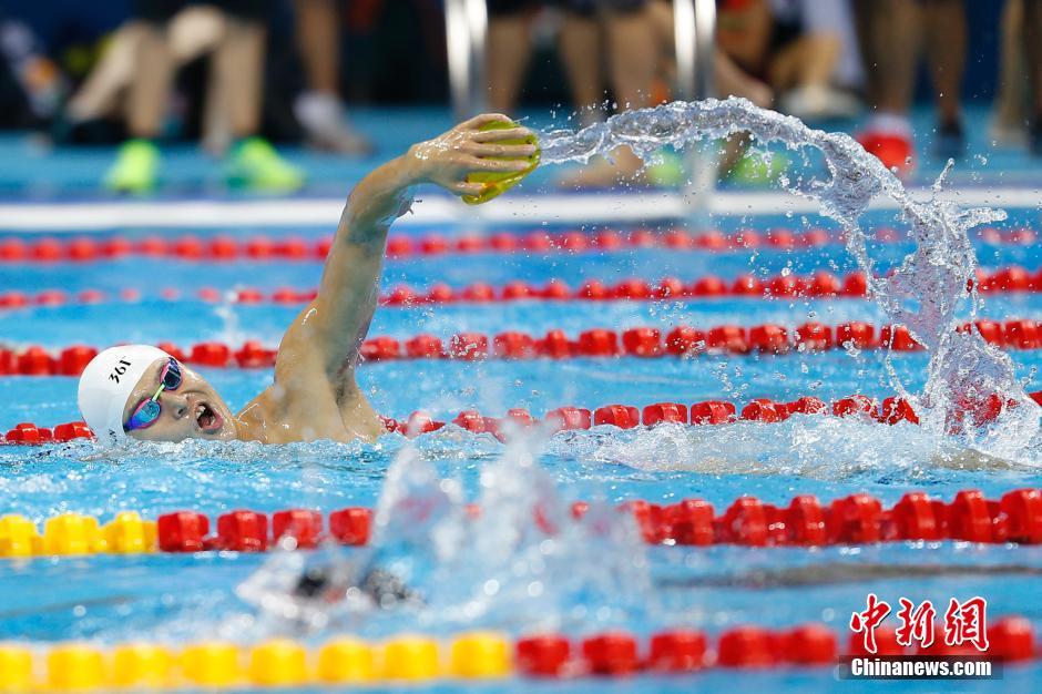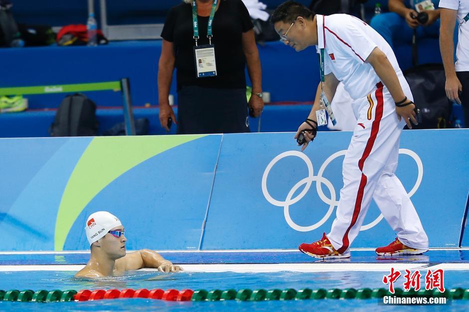 當?shù)貢r間8月4日,里約奧林匹克水上項目體育館,中國游泳選手孫楊在泳池內(nèi)進行賽前訓練。中新網(wǎng)記者 盛佳鵬 攝
