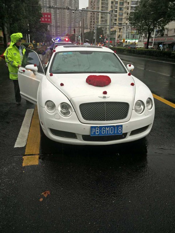 下午2點45分許,上海交警總隊機動支隊巡邏時,在周家嘴路近大連路處發(fā)現一路婚車車隊,共計5輛車,其中領頭的是懸掛“滬BGM018”牌號的白色賓利歐陸跑車。后經查實,此車為套牌車。