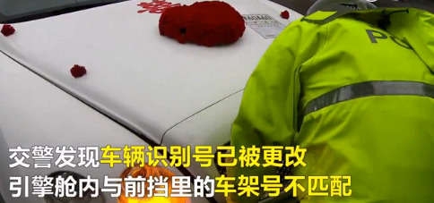 民警在跟隨過程中,使用警用PDA查詢車輛信息,發(fā)現登記車輛為灰色,明顯不是眼前的白色跑車,隨即將婚車車隊攔停后,詢問駕駛員車輛來源。