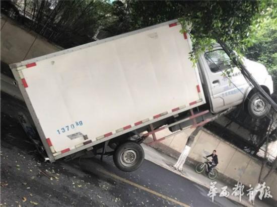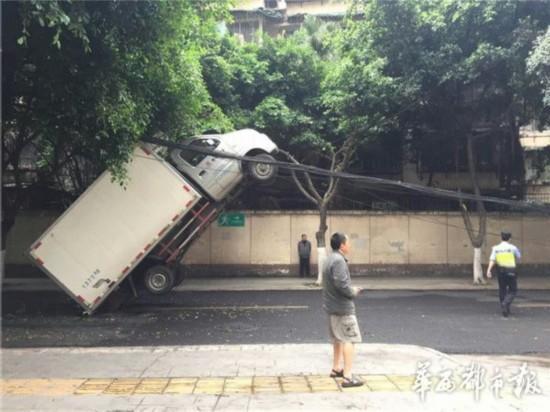 5月10日早上,成都高升橋北街,一輛貨車玩起“特技”,車頭掛在線纜上,四輪騰空,造成道路擁堵,索性無人員傷亡。隨后,記者從成都交警一分局獲悉,該事故的罪魁禍首,是掉落的通訊線纜。來源:華西都市報