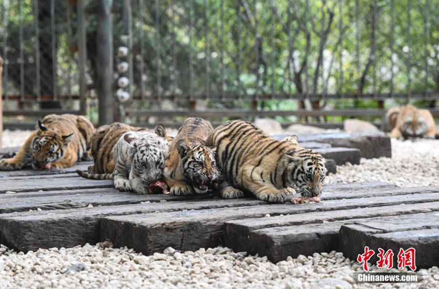 10月17日,濟(jì)南野生動(dòng)物世界2017年誕生的12只小老虎集中亮相,霸氣模樣吸引許多游客駐足觀賞。據(jù)悉,濟(jì)南野生動(dòng)物園2017年共繁育成活26只小老虎,其中2只是“虎中極品”金虎。 中新社記者 張勇 攝