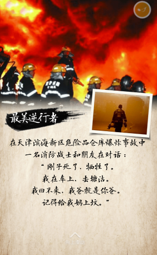 在天津?yàn)I海新區(qū)危險(xiǎn)品倉庫爆炸事故中,一名消防戰(zhàn)士和朋友在對話:“剛子死了,犧牲了。我在車上,去塘沽。我回不來,我爸就是你爸。記得給我媽上墳?!?/p>