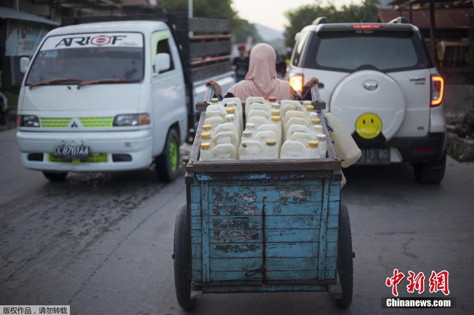 當?shù)貢r間2018年3月21日, 印尼西蘇拉威西省Tinambung,村民Mama Hasria和其他當?shù)嘏悦刻毂澈笙抵s200個空壺子逆流而上,到河上游為他們的社區(qū)打干凈的水。