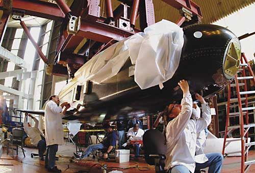正在制造中的X-37B。X-37太空飛機,也簡稱為“X-37”,是美國國防部與宇航局共同制定的“FALCON”計劃、為實現(xiàn)“快速全球打擊”的構(gòu)想而研制的一種空天飛機。這種空天飛機在兩小時內(nèi)可攻擊地球上任意一個目標?!癤-37”太空飛機是“FALCON”項目中的第一個預(yù)研型號,是與微型航天飛機相似的飛行器。它將驗證NASA軌道太空飛機項目中25項創(chuàng)新的航天技術(shù)。