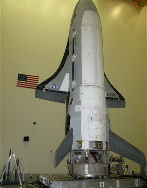 X-37B無人航天飛機。X-37B長約8.8米,翼展約4.6米,起飛重量超過5噸。飛機減速離開太空,可能使用范登堡空軍基地長4600米、寬61米的跑道著陸。在軌道上,此航天飛機可以從事情報收集、發(fā)射小衛(wèi)星、測試太空設(shè)備等工作。
