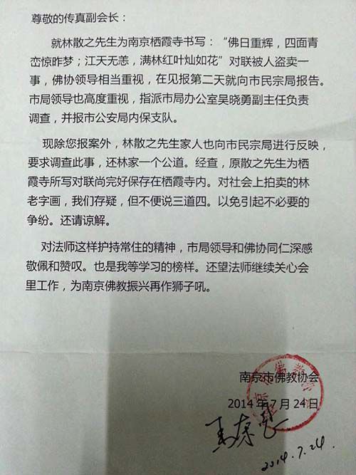 7月24日,傳真法師收到一封南京市佛教協(xié)會(huì)的回函?;睾Q,除了傳真法師報(bào)案外,林散之家人也向市民宗局反映,要求調(diào)查此事,還林家一個(gè)公道。