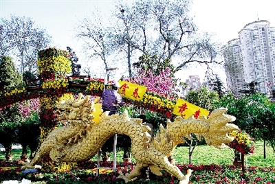 此次花展分別布置了“雙龍競(jìng)春”、“綠島探春”等5個(gè)立體和平面花壇,有配花如牽?;?、三色堇等兩萬(wàn)余盆,另有袖珍葉子、散尾葵、綠茉莉、夏威夷等近千盆點(diǎn)綴,其中景點(diǎn)“樂童嬉春”的“魔方”使用7000余枝鮮切花康乃馨制成。