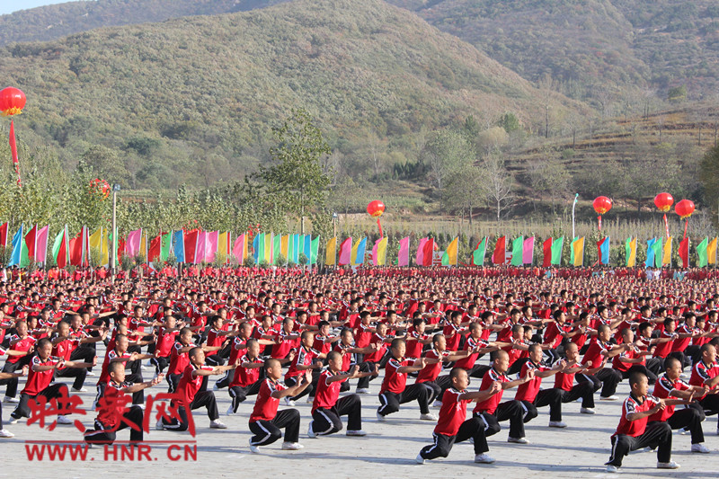 10月22日,少林寺塔溝武術(shù)學(xué)校的學(xué)員在第九屆中國鄭州國際武術(shù)節(jié)迎賓式上表演萬人團體武術(shù)。