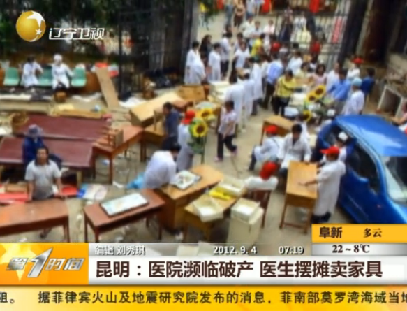 9月1日下午,在位于西山區(qū)麻園路9號(hào)的云南博愛醫(yī)院100平方米左右的院子里,各式各樣的家具雜亂地?cái)[放著,有病床、床頭柜,還有護(hù)士辦公的前臺(tái)。家具中間站著幾十個(gè)人,穿著醫(yī)生和護(hù)士的制服,賣力地叫賣著。該醫(yī)院副院長(zhǎng)稱,博愛醫(yī)院租用的場(chǎng)地到期,而且醫(yī)院投資失敗瀕臨破產(chǎn),只得變賣資產(chǎn)安置醫(yī)護(hù)人員。